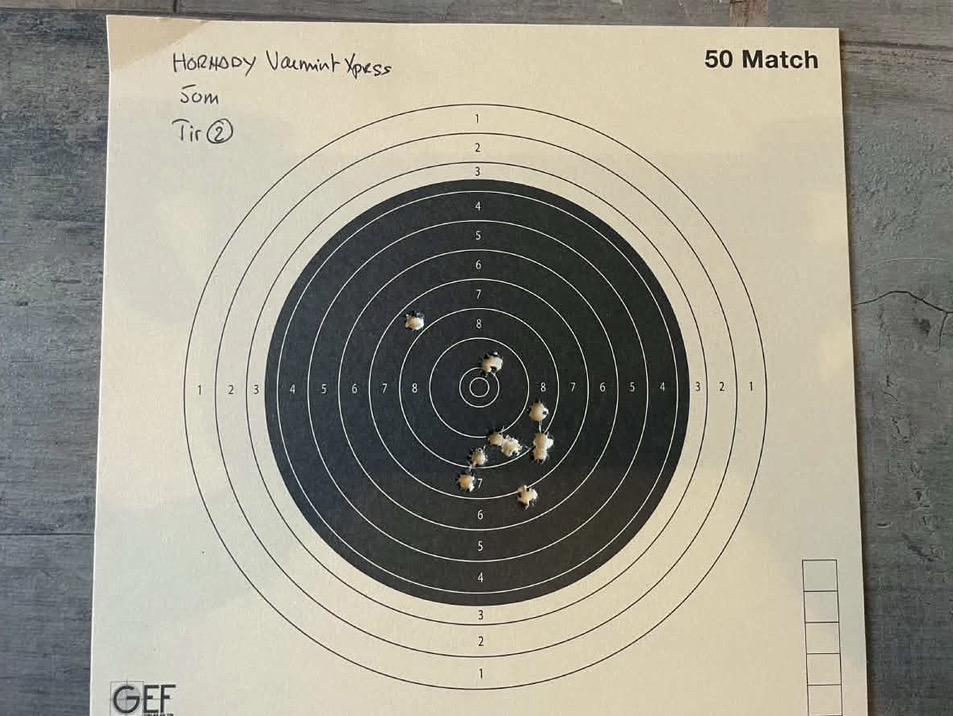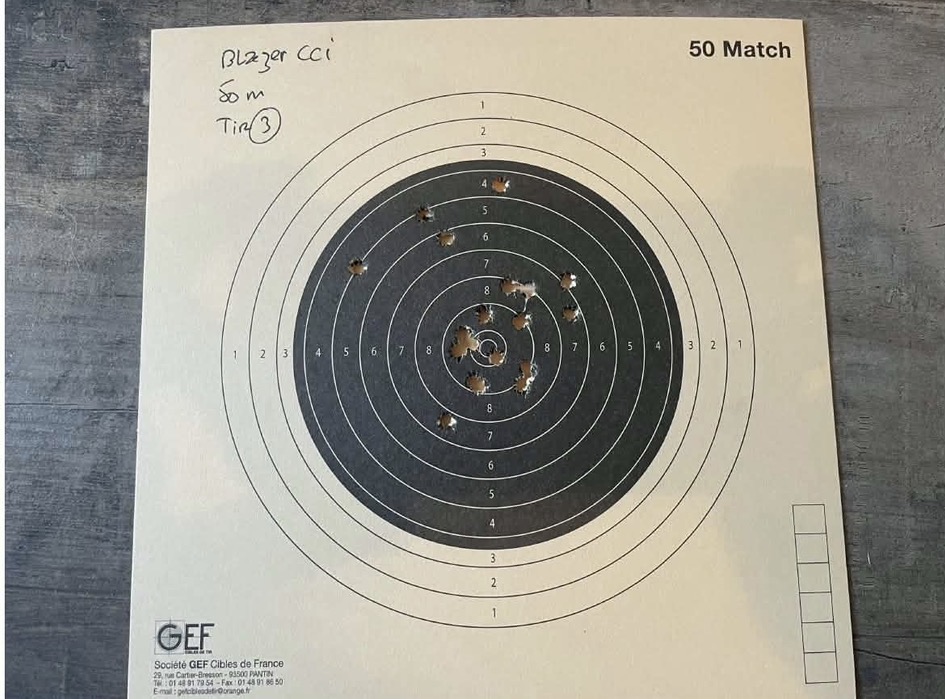 Le groupement est correct sur 20 cartouches tirées. Moins performant que certaines références, mais fiable.