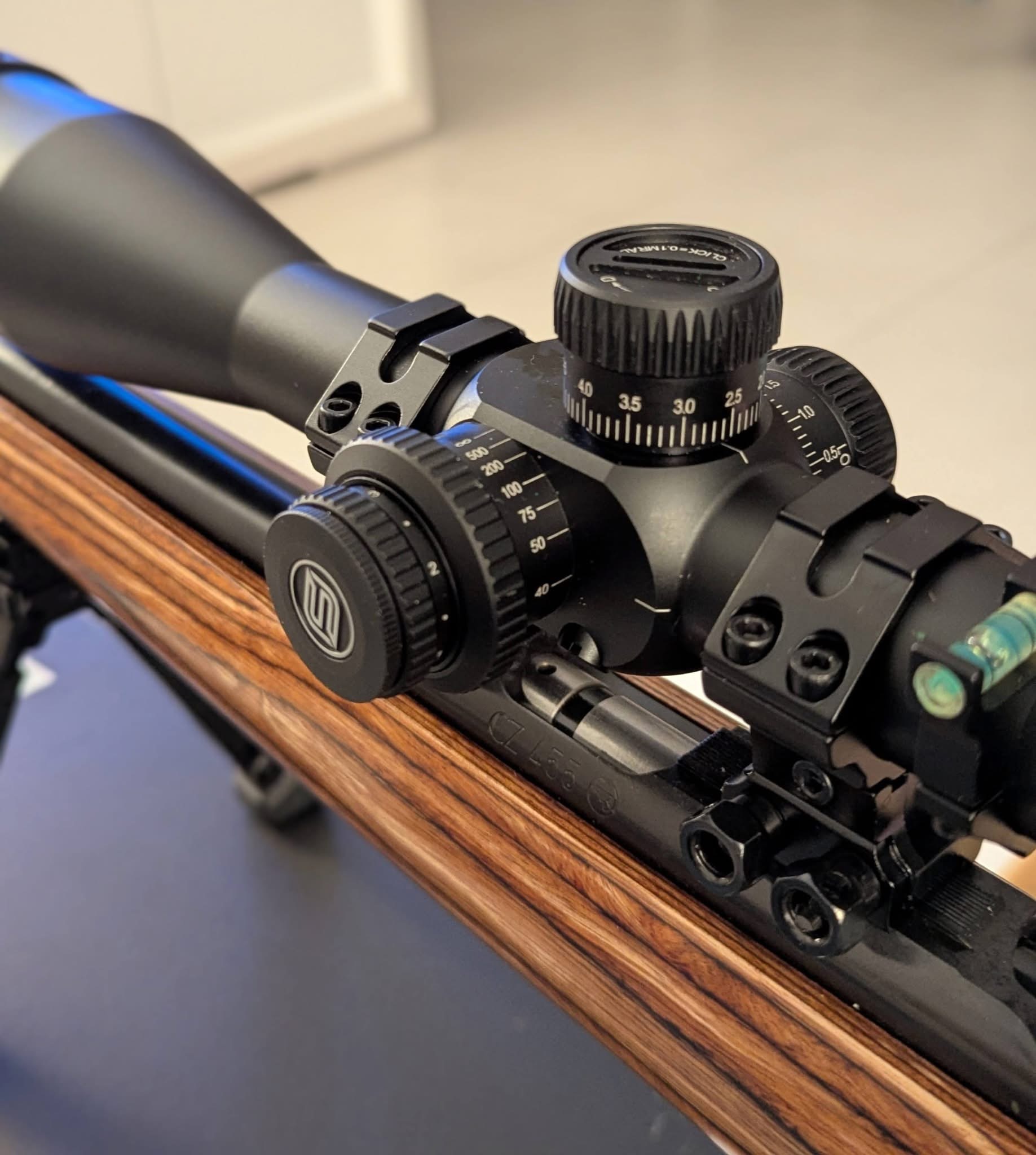 Montée sur une carabine en .308 avec rail Picatinny, la lunette s’installe facilement grâce à sa monture QD (Quick Detach) fournie. Ce système permet de retirer ou remettre la lunette sans outil, tout en conservant le zéro. Lors de nos essais, le maintien s’est révélé excellent, même après plusieurs démontages. La lunette encaisse sans broncher le recul du .308, preuve d’une conception sérieuse.