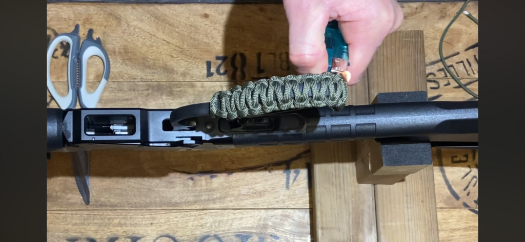 Coupez l’excédent de paracorde puis chauffez légèrement les extrémités au briquet afin de faire fondre la fibre.